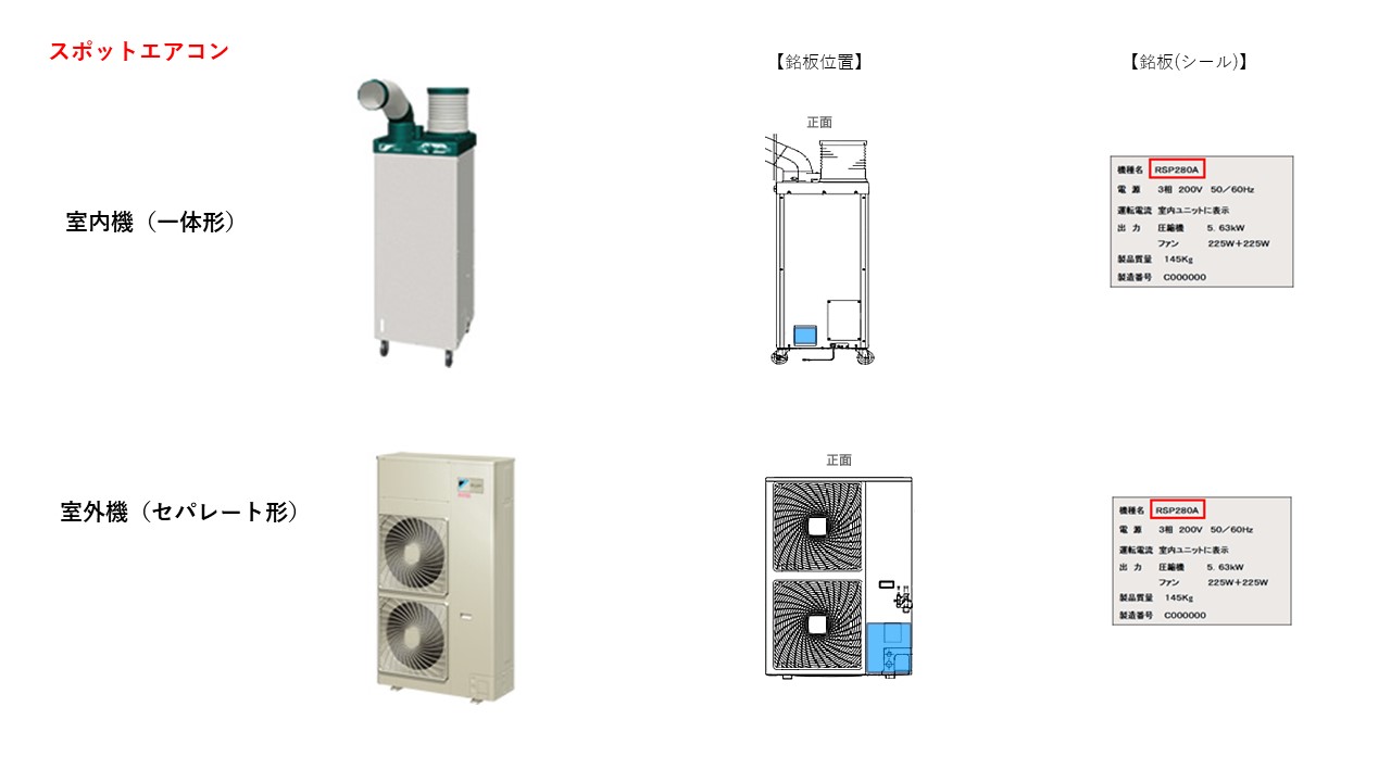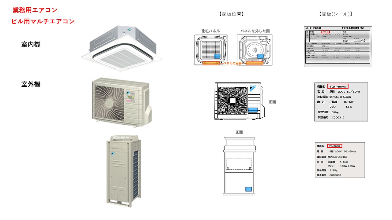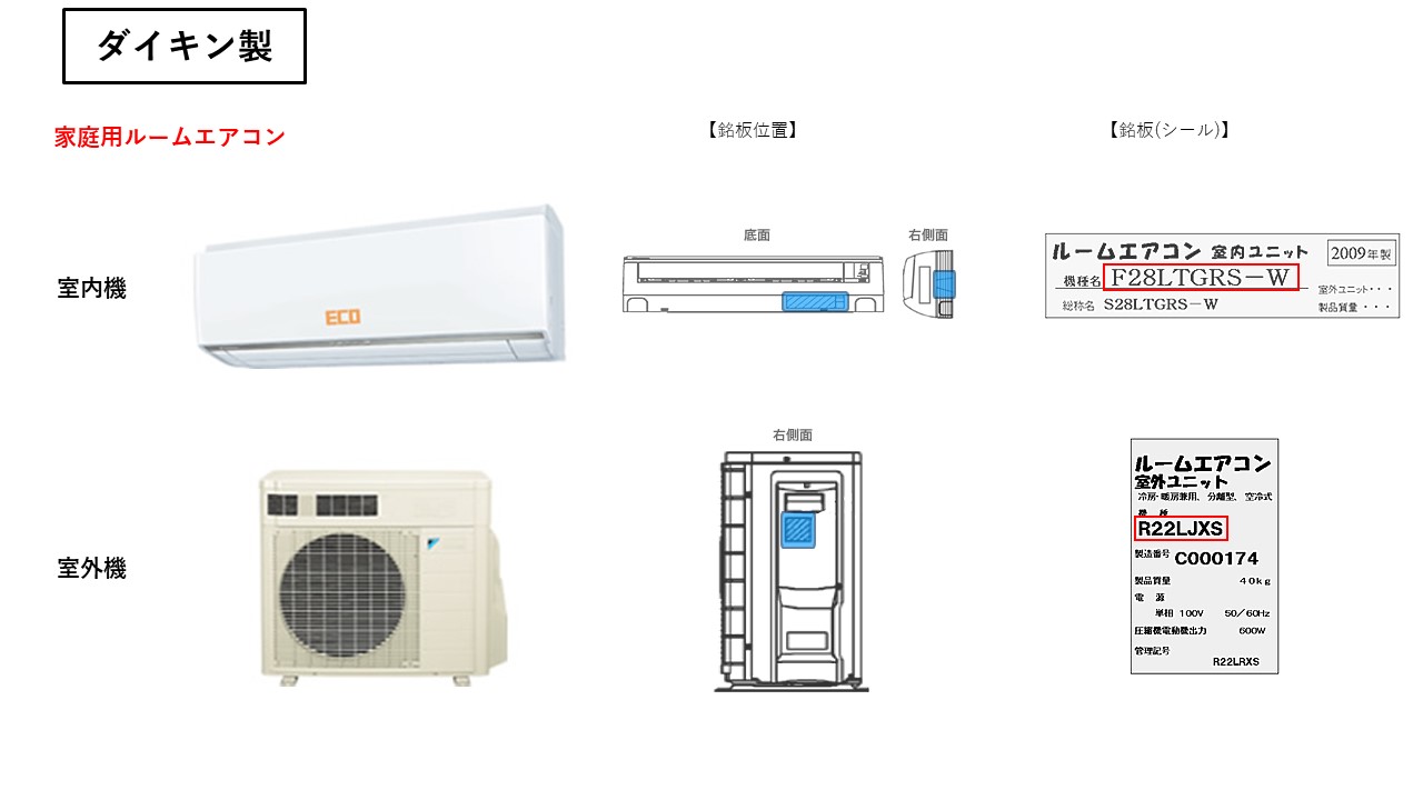 主に、室内機には機種名、室外機には機種名・電源・製造番号・冷媒の種類などが記載されています。お客様自身で確認ができるようでしたら、事前にチェックをお願いいたします。